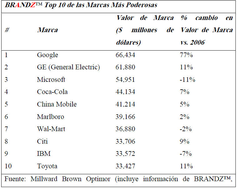 Las marcas fuertes aprovechan de manera efectiva las principales tendencias del mercado para crear valor financiero. Son capaces de extenderse hacia áreas de oportunidad capturando nuevos flujos de ingreso y de responder a los cambios del mercado. Un consumidor vinculado a Google también estará dispuesto a probar sus otros servicios: Google Earth, Google Desktop, Gmail, Picasa, Blogger, iGoogle, YouTube. Este impulso de crecimiento en el corto plazo es posible cuantificarlo y es muy favorable para Google. No debe sorprender entonces que su valor financiero creciera 77 por ciento en un año.